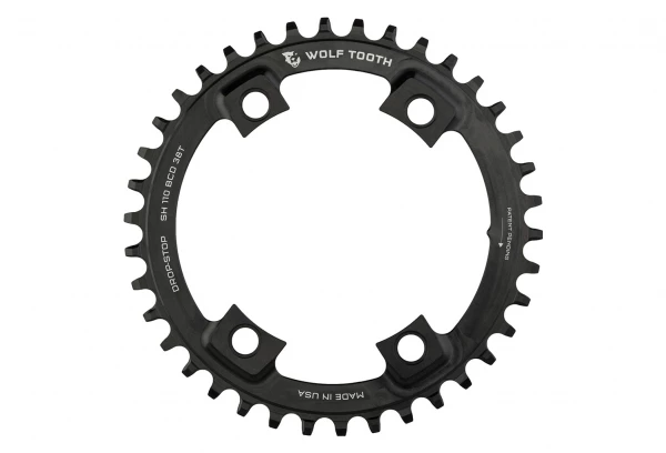 - Technologie Drop-Stop : sur les plateaux wide/narrow brevetés de Wolf Tooth, le côté large (Wide) de la dent a un contact maximal du côté entraînement, ce qui répartit la charge et améliore la durée de vie du plateau. Le côté étroit (Narrow) permet un dégagement pour la boue et les débris, ce qui réduit la friction.