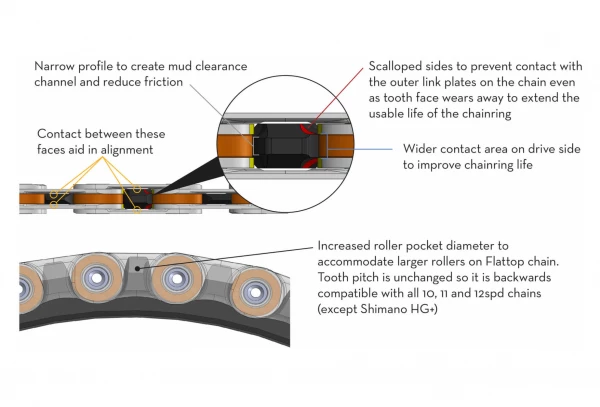 - Technologie Drop-Stop : sur les plateaux wide/narrow brevetés de Wolf Tooth, le côté large (Wide) de la dent a un contact maximal du côté entraînement, ce qui répartit la charge et améliore la durée de vie du plateau. Le côté étroit (Narrow) permet un dégagement pour la boue et les débris, ce qui réduit la friction.